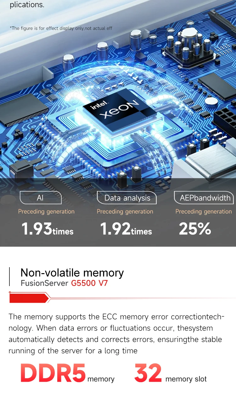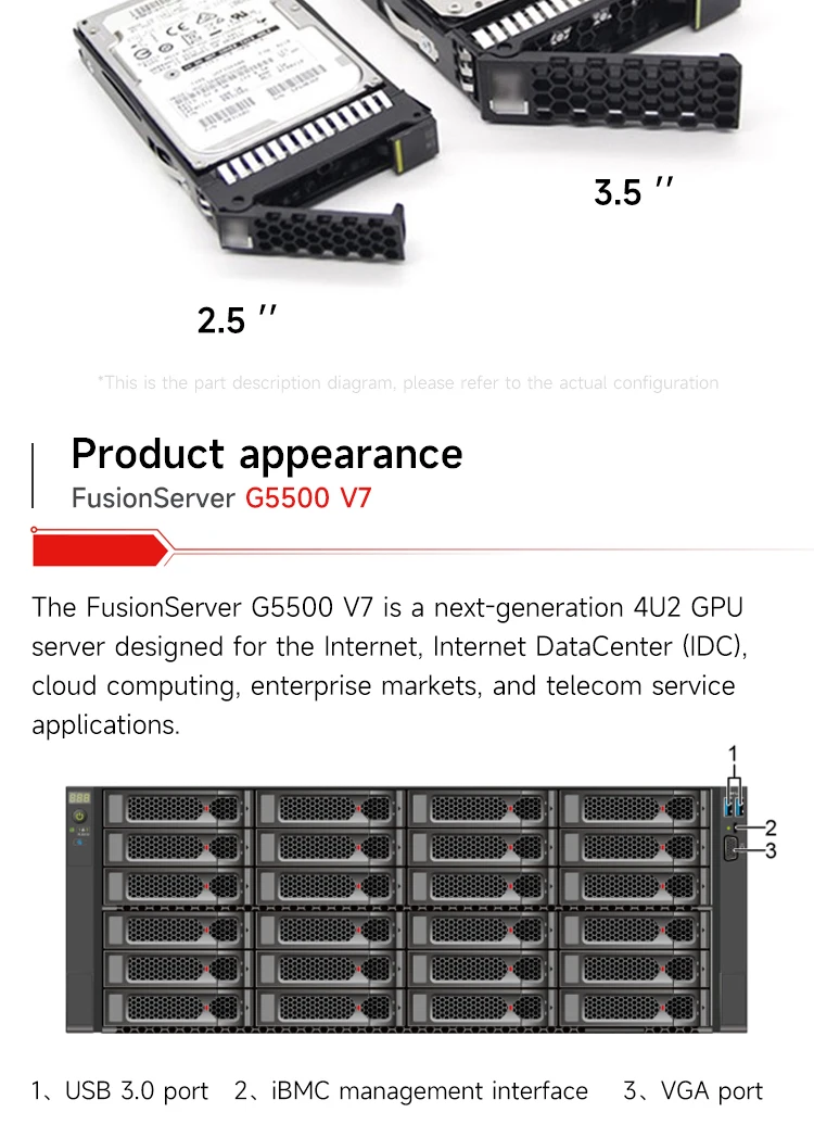 FusionServer G5500 V7 (G5500 V7) is a next-generation 4U 2-socket GPU server. it supports up to 10 xdual-wvidth GPU cards and has the capability to accommodate 4 x standard PCle cards and 3 x OCP cardsfor extensive expansion. With 24 x 3.5" drives or 12 x NVMe SSDs, it provides remarkable storage optionswith ultra-large capacity or ultra-fast storage. G5500 V7 features high performance, flexible architecture.solid reliability, easy deployment, and simplified management. lt is designed for accelerating applicationssuch as Al training, Al inference, hiah-performance computing (HPC), image and video analysis, anddatabases, and supports enterprise and public cloud deployment.