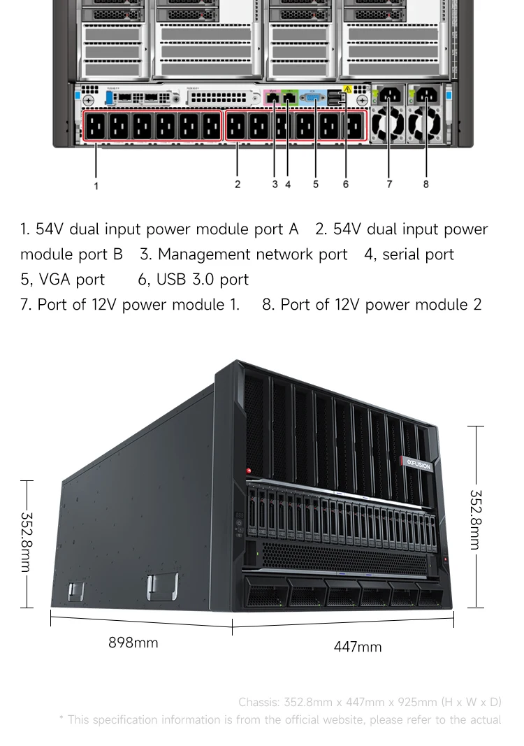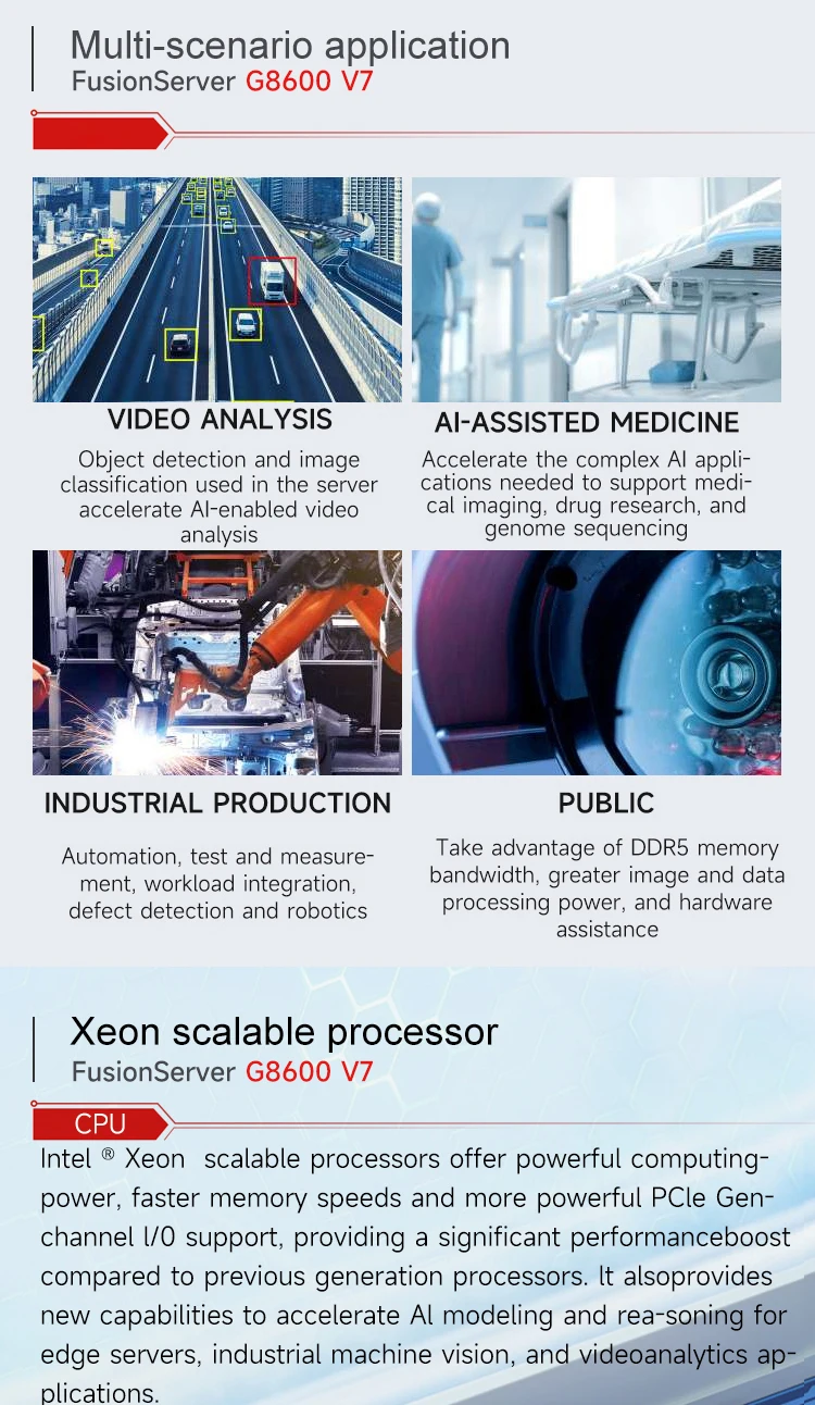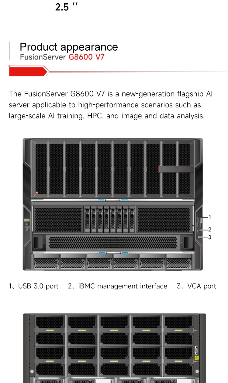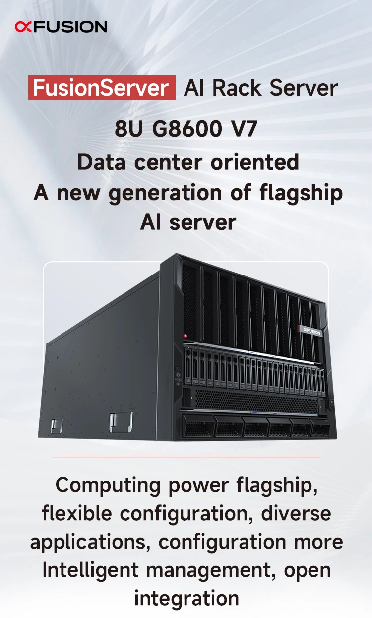 • FusionServer G8600 V7 (G8600 V7) is a new-generation flagship GPU server. It supports 8 x GPU modules, 12 x standard PCIe cards,and 1 x OCP NICs, and provides ultra-large capacity or ultra-fast storage through 25 x 2.5" drives and 8 x NVMe SSDs.