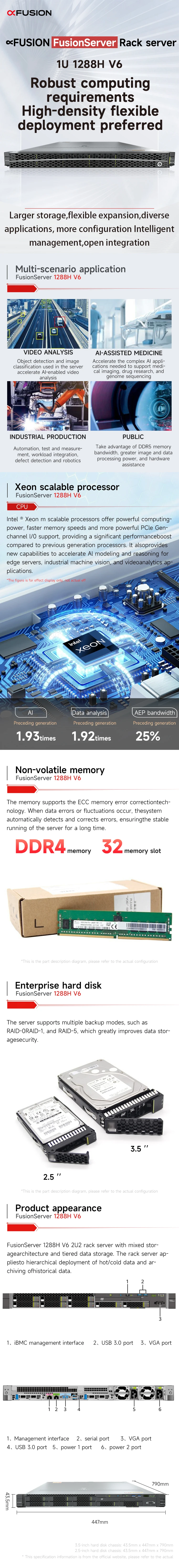 The FusionServer 1288H V5 is a 1U 2-socket rack server that is suitable for high-density workloads such as cloud computing, virtualization, high-performance computing (HPC), and big data processing Deployment to improve data center space utilization. The 1288H V6 can be configured with 2 Intel ® Xeon ® Scalable processors, 32 Wisers DDR4 RAM, and 4*3.5" in 1U space.or 10 x 2.5" local storage resources (configurable with 4/10 NVMe SSD drives). Integrate DEMT intelligent power management, FDM intelligent fault management and other patented technologies, optional With FusionDirector lifecycle management software, it can effectively reduce operating costs and improve return on investment.